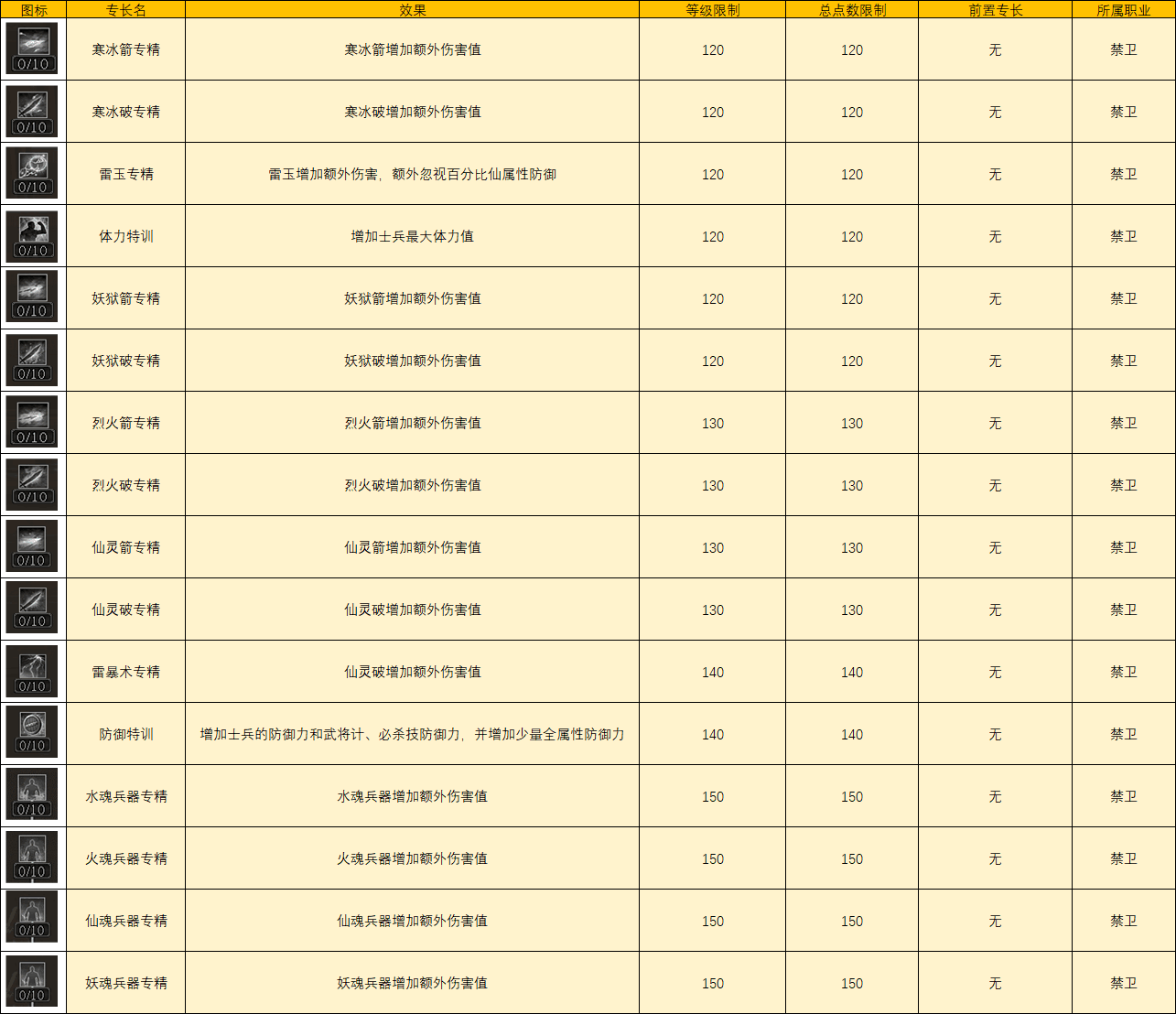 禁卫的部分专长可以提高法系技能的伤害。除此之外,禁卫的“防御特训”专长可以增加麾下士兵的防御力和对武将技、必杀技的防御力,并增加少量额外的全属性防御力,彰显了这个职业对于士兵的巨大提升作用,也是禁卫职业的特色专长之一。