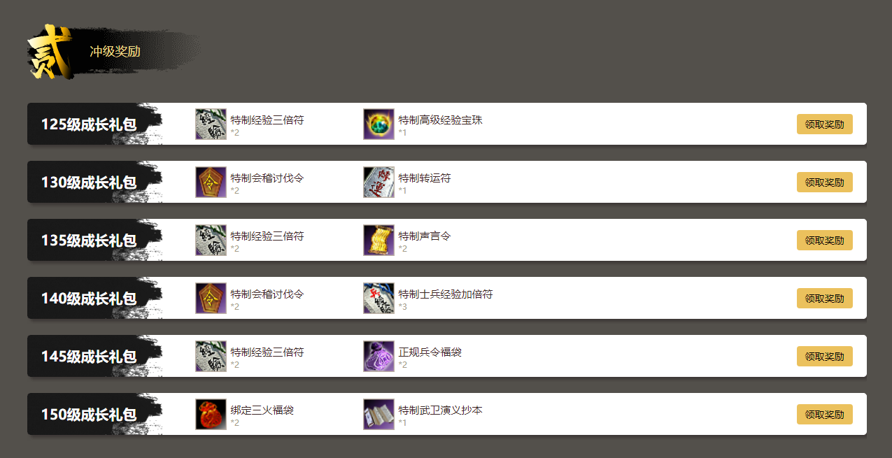 玩家从120级到150级,每升五级都可在活动页面领取一个成长礼包,礼包内含经验符、讨伐令、福袋等道具,全力助阵玩家的升级之旅。除此之外,新手玩家也可以在1级到120级阶段通过招募活动来获取成长礼包。