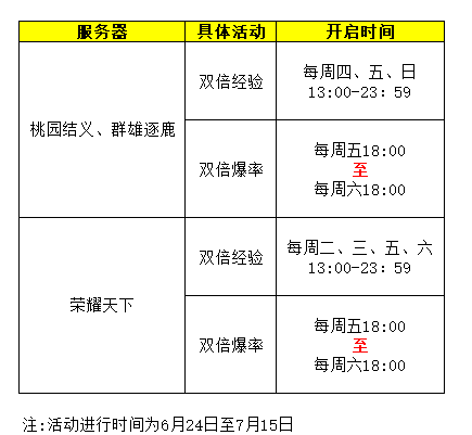 活动期间内将开启双倍经验、双倍爆率活动,可以帮助主公们快速冲级以及获得更多宝物掉落!还请各位主公注意,由于各服务器的国战时间不同,所以各服务器的双倍经验开启时间也并不一致,请您以下方示意图中的信息为主。