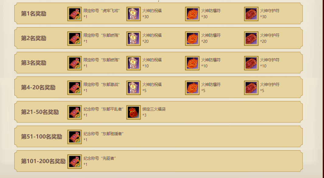 冲级排名活动也将再次开放,截止至活动结束,冲级排行榜上前200名的玩家都可以获得纪念称号奖励,前20名的玩家可以获得限定称号和大量“三火道具”奖励,而排名第一的玩家则能够获得版本限定称号“虎牢飞将”,成就冲级最速传说之名!