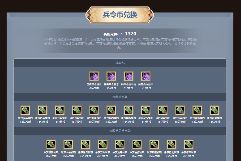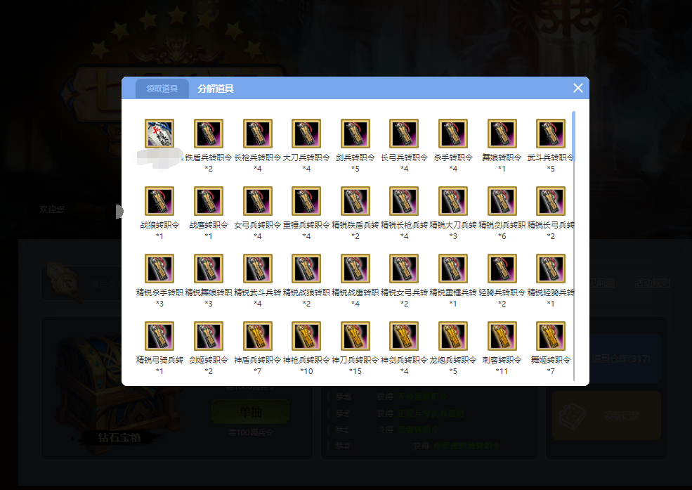 抽取到的道具将会收纳在主公的道具仓库内,主公们可以在仓库内进行领取。此外,如果有不需要的兵令,主公还能将多余的兵令分解成“兵令币”,在兑换界面消耗“兵令币”,换取想要的道具!不同的道具分解获得的兵令币数量不同,稀有度越高的道具分解获得的币越多哦!具体分解表格将在活动页面公示,还请各位主公仔细确认。