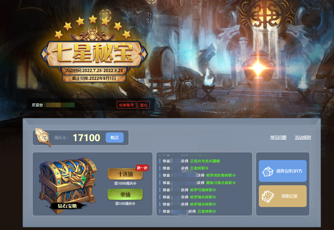 在七星秘宝活动页面,可以购买特制士兵经验加倍符,附赠钻石宝箱开启所需的“调兵令”!单次抽取消耗100调兵令,十连抽取消耗1000调兵令。此外,十连抽还将会赠送一次抽取次数,将会获得11个道具!通过抽取可以获得各式道具,包括一般兵种、稀有兵种、士兵神器等珍贵道具,还包括了本次的新兵种——忍者、修罗忍者和象骑兵!