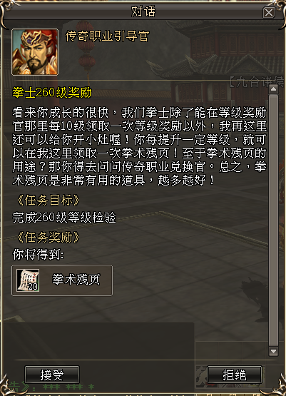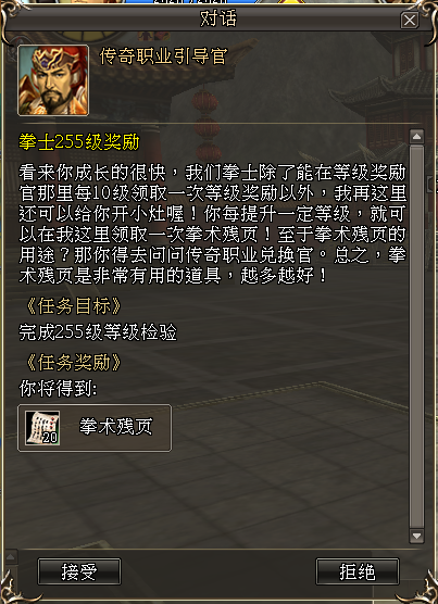 2)传奇职业引导官处,新增任务《拳士255级奖励》《拳士260级奖励》