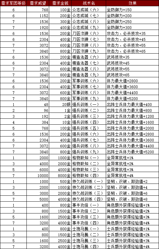 ·新增军团战术以及需求如下