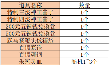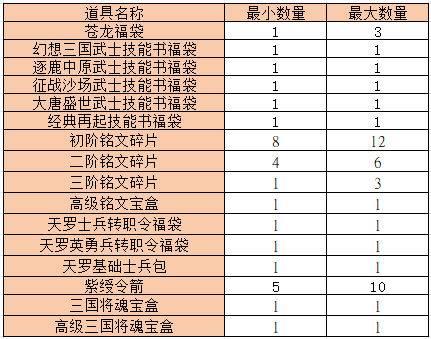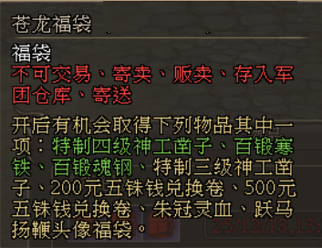 2. 每次完成【龙抬头】任务,可从“深海水精*3”与“万孽丹*3”中任意选取一种奖励,并获得固定奖励“苍龙福袋*1”。打开“苍龙福袋”,有概率获取如下道具(每次仅获得一种道具):