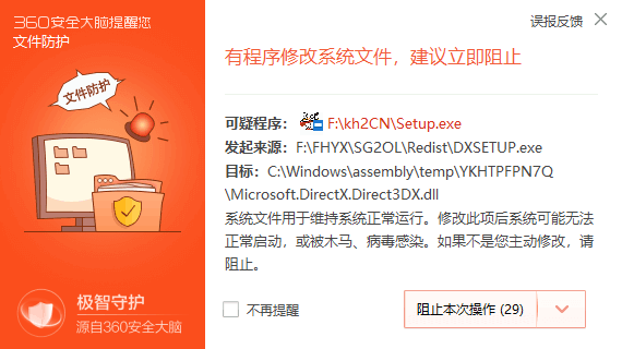 常见错误如图,出现以下问题请允许本次操作。如果误点“阻止本次操作”,可以在安装目录(\SG2OL\Redist)下找到vcredist_x86.exe文件手动安装。