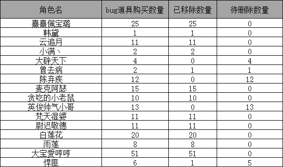2、已使用异常道具的玩家,在4月29日9:00(下周四例行维护前),包裹或仓库内需留有相应数量的道具。对应道具将在维护时移除,并返还购买金额的元宝(预计3个工作日之内)。
