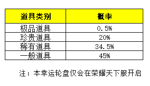 本次幸运轮盘将仅于荣耀天下服务器开启,概率公示如下: