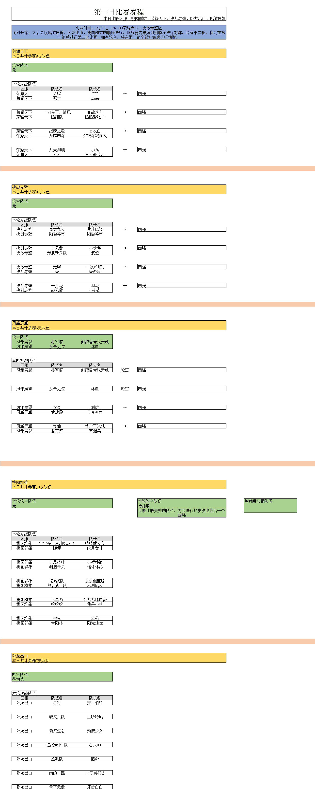 12月7日比赛区服为:桃园群雄、荣耀天下、决战赤壁、卧龙出山、凤雏展翼。比赛将于12月7日晚19:00开始,荣耀天下、决战赤壁两个区同时进行。