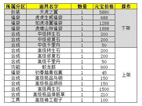 ·下架元宝商城内的虎啸山林福袋、如虎添翼福袋、虎虎生威福袋、天虎之翼