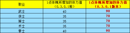 ·各职业体魄影响的体力增加值提升,具体数值如下