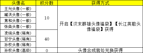 长江英歌一般福袋中,概率提升的头像为:王允、臧洪、焦和、张奂