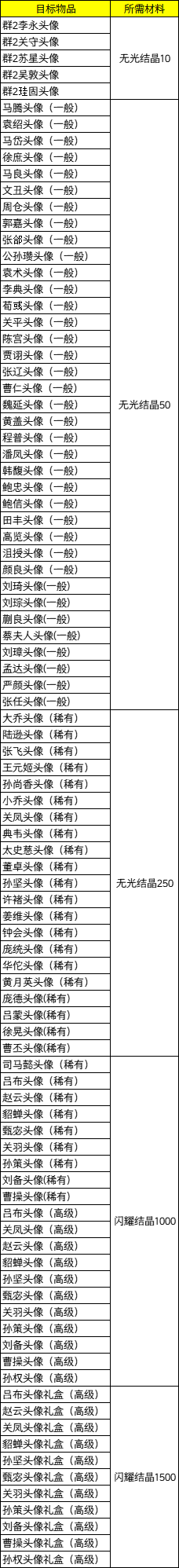 其他头像为:马腾、袁绍、马岱、徐庶、马良、文丑、周仓、郭嘉、张郃、公孙瓒、袁术、李典、荀彧、关平、陈宫、贾诩、张辽、曹仁、魏延、黄盖、程普、潘凤、韩馥、鲍忠、鲍信、田丰、高览、沮授、孙权、刘琦、刘琮、蒯良、蔡夫人、刘璋、孟达、严颜、张任
