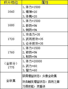 3)增益状态:百将之首效果增强为【体力+7000、武将技防御力+1500、必杀技防御力+1500、出阵士兵全攻击力+100、出阵士兵全属伤+2%、出阵士兵全属防+20%、出阵士兵抵伤率+20%、攻击时有50%几率获得增益状态:百将之首】