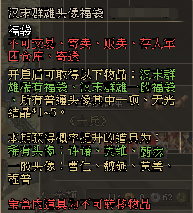 汉末群雄一般福袋中,概率提升的头像为:曹仁、魏延、黄盖、程普