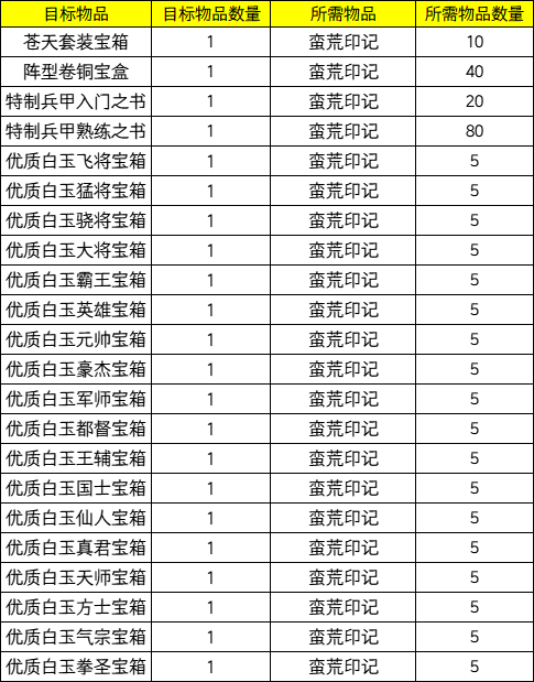 ·蛮夷秘贩的兑换列表如下