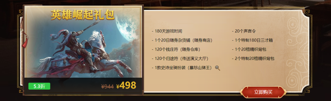 喜迎月卡服公测,超值礼包将同步上线!英雄崛起礼包(包含180天月卡时间)原价944元,仅售498元;天命所归礼包(包含180天高级月卡时间)原价1582元,仅售688元。限时优惠,购买即享超值福利!