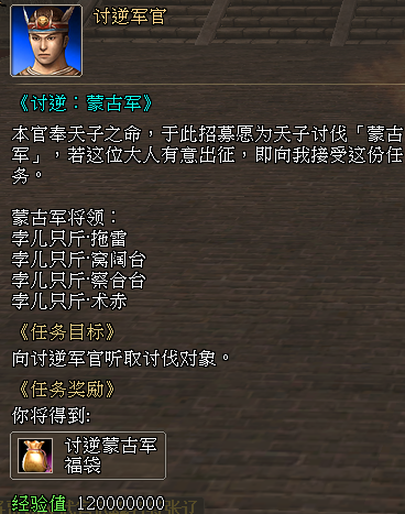 4、增加全新的每日讨逆任务《讨逆:蒙古军》,该任务承接等级为326级至330级
