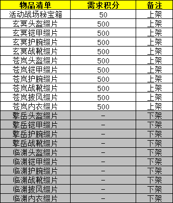 · 当前的“活动战场秘宝箱”更名为“(旧)活动战场秘宝箱”,且新的“活动战场秘宝箱”将会上架积分商店,宝箱内容不变