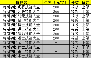 · 凤凰谷轮播王、「界桥之战」副本王、世界王“潘凤、邢道荣、夏侯恩、公孙瓒、赵云、公孙越、刘繇、太史慈、笮融、颜良、文丑”新增“枪魂诀术诀、巨箭法术诀、将军令术诀、气灸术术诀、踏乱蹄术诀、巧连击术诀、瞬穿魂术诀、八荒合术诀、三阶武士技能福袋、三阶侠士技能福袋、三阶策士技能福袋、三阶术士技能福袋、精锐兵技能书福袋”的产出