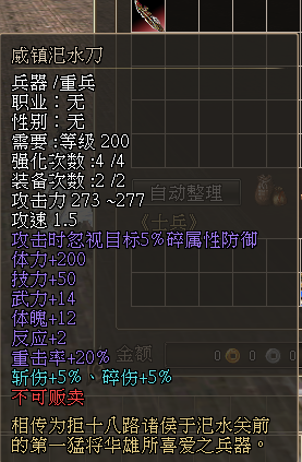 击败Boss华雄,也有机会获得名将武器“威震汜水刀”。此刀刀身赤红如血,挥舞时常含血煞之气,令敌人闻风丧胆。“威震汜水刀”攻击时可忽视目标5%的碎属性防御,是一把强绝无比的碎伤武器!