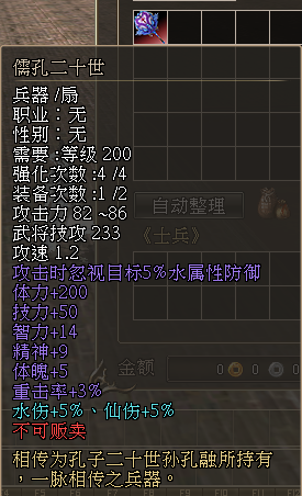 如:名将武器“儒孔二十世”是由Boss孔融掉落的武器,对于水系技能的增幅十分可观,属性面板也十分优秀。作为孔氏家传的宝物,“儒孔二十世”在年复一年的书声朗诵之中变得颇具灵性,是与法系职业无比契合的一把武器。