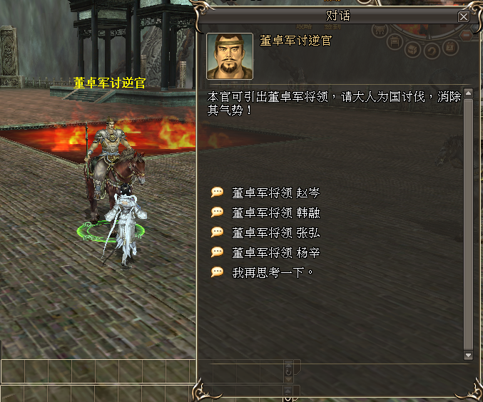 随后,玩家与NPC董卓军讨逆官对话,即可选择并对战四名董卓军将领:赵岑、韩融、张弘、杨辛。这些勇猛的西凉猛士连克强敌,士气正浓,玩家们面对这般锐不可当的军势,务必要小心谨慎,击破这些强大的西凉将领,不仅可获取讨逆福袋奖励,还可获得海量经验值!