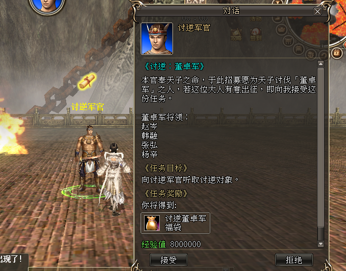 版本更新后,玩家可以通过演义大厅执事官进入演义大厅,然后进入90级讨逆副本。在讨逆副本中,180级以上的玩家可以通过NPC讨逆军官领取《讨逆:董卓军》任务。