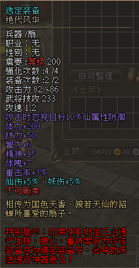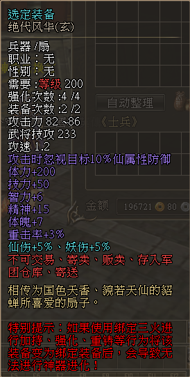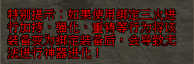 特别提示:如果使用绑定三火对神器、玄之神器、士兵神器进行加持、强化、重铸等行为,将其变为绑定装备后,会导致在未来版本中,其无法进行神器进化!