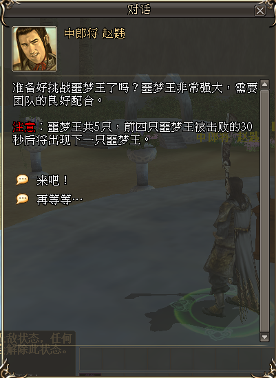 ·在噩梦副本中,可与NPC中郎将 赵韪 对话选择开始噩梦挑战。开始挑战后,将召唤出第一只噩梦王,前四只噩梦王在被击败后,将于30秒后出现下一只噩梦王