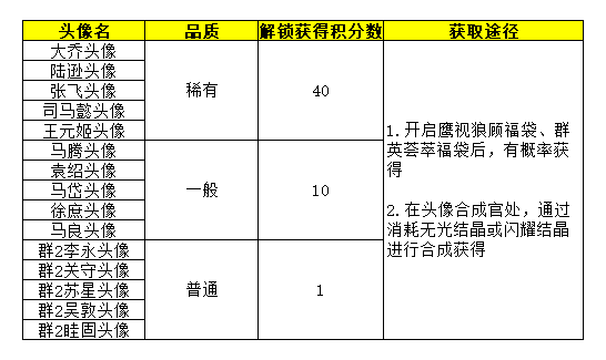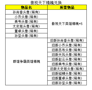 注:傲视天下、群雄争霸英雄精魄仅限兑换前三期头像,无法兑换第四期及其之后的头像