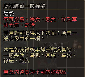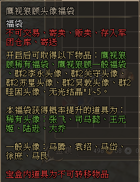 鹰视狼顾一般福袋中,概率提升的头像为:马腾、袁绍、徐庶、马岱、马良;其他头像为:文丑、周仓、郭嘉、张郃、公孙瓒、袁术、李典、荀彧、关平、陈宫、贾诩、张辽。