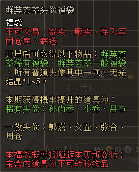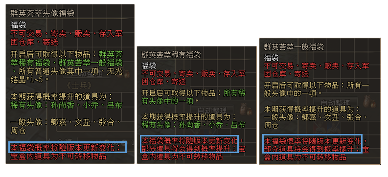 2. 群英荟萃头像福袋、群英荟萃稀有福袋、群英荟萃一般福袋,目前存在文案问题,其福袋概率不会随版本更新而变化,道具概率不会变化;此文案问题不影响正常使用,后续会尽快进行修复