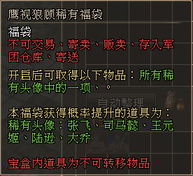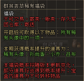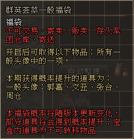 群英荟萃一般福袋中,概率提升的头像为:文丑、周仓、郭嘉、张郃;其他头像为:公孙瓒、袁术、李典、荀彧、关平、陈宫、贾诩、张辽、马腾、袁绍、徐庶、马岱、马良。