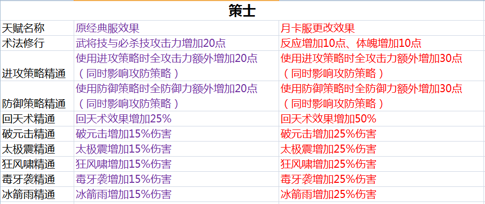 首先,为大家介绍下月卡服二测时的策士专长改动,具体如下: