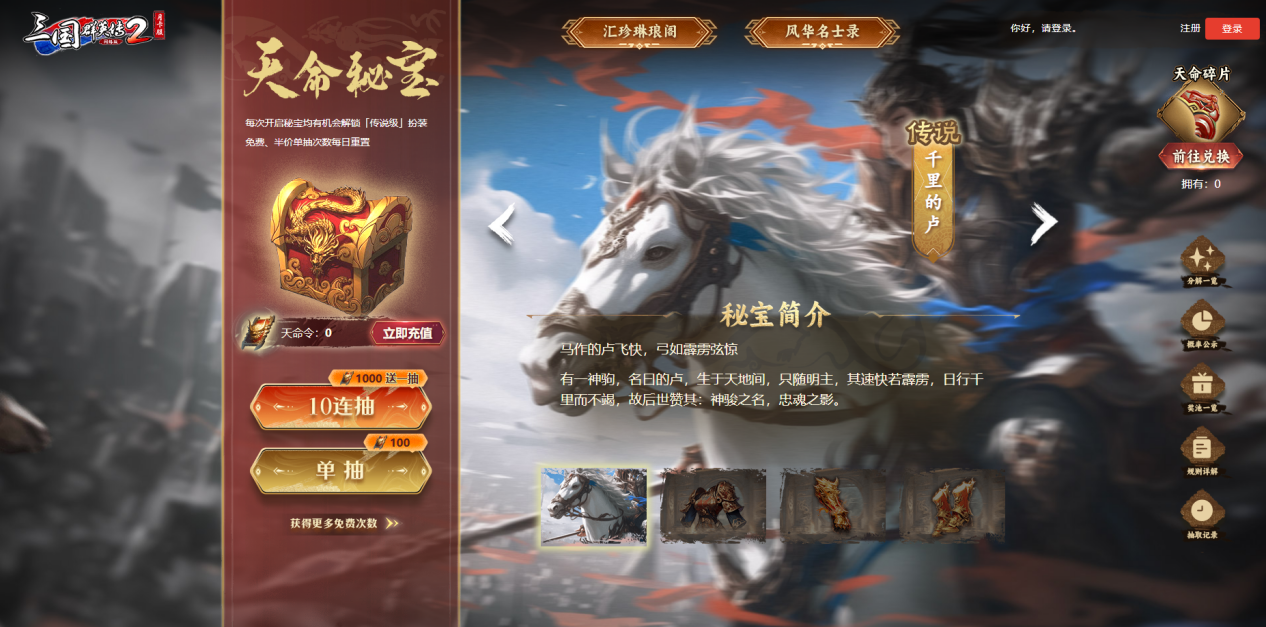 玩家们参与“天命秘宝”活动,均有机会获得极品扮装!活动期间,各位玩家每个自然日均可以获得两次免费抽奖机会,其中一次为通过每日登录活动页面获取;另一次为通过风华名士录点赞3次获得。