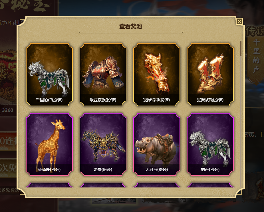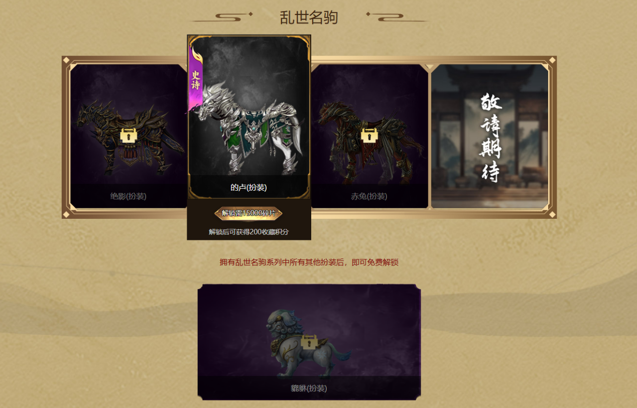 在“天命秘宝”活动中,玩家将接触到近百款独特扮装,包括全新的传说级别扮装——光彩夺目的特效坐骑“千里的卢”和瑰丽多姿的全身扮装“欧亚豪族”等。这些丰富的炫酷扮装,不仅将在视觉上为玩家带来震撼的体验,还将赋予玩家一种独特的身份感,为玩家的角色增添无限风采,满足多样化收藏爱好!