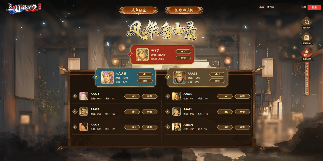 在【风华名士录】中,将基于各位玩家的扮装收集总积分进行排名,展示每位玩家的独特风采和时尚品味!玩家在其中还拥有探索自由,可以通过搜索功能访问并欣赏其他玩家的收藏。