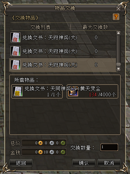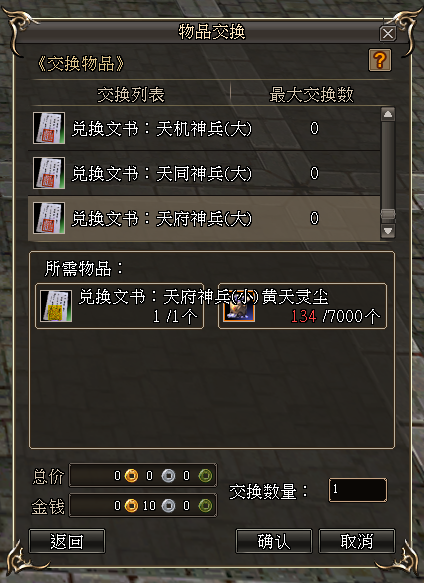 3)灵尘兑换:除了橙武的同阶转换和小橙武转换为大橙武外,太平灵尘也可按照1比1的比例兑换为黄天灵尘。