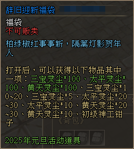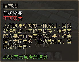 · 开启限时世界掉落活动,掉落物品为“屠苏酒”,本次活动预计持续至2025年1月14日维护前