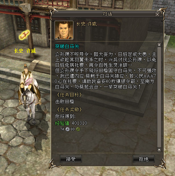 · 主公们可在东郡的「长史 许威」处接取《突破白马关》任务,完成任务后即可前往“白马”